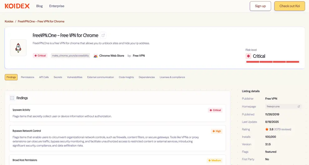 FreeVPN.One se convirtió en spyware: Después de una actualización en abril de 2025 (a la versión 3.0.3), la extensión de Chrome añadió un permiso que le permitía acceder a todos los sitios que el usuario visitaba.